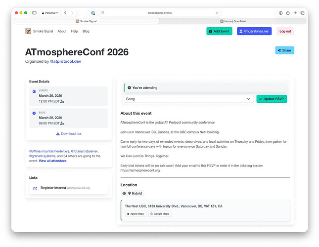 Smoke Signal just got a major update featuring redesigned event pages, ATProtocol facets support, cryptographically verified RSVPs with attestations, private content controls, email notifications, rich profiles, and experimental AI agent integration through the Model Context Protocol.